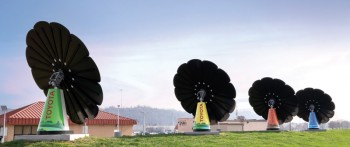 Five SmartFlower solar arrays help power the facility’s employee services buildings, and also help power three EV charging stations.